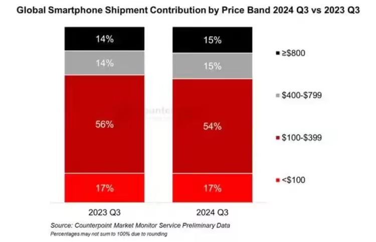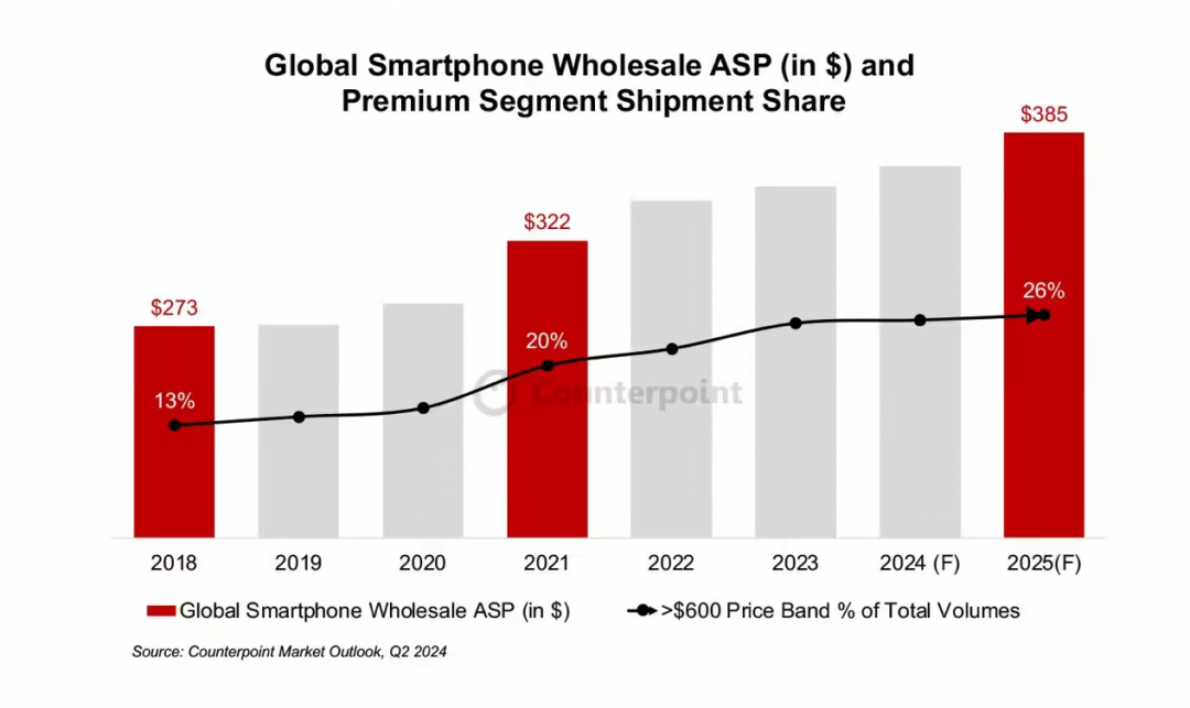 这一上涨趋势的背后,是全球智能手机市场高端化的加速。Counterpoint的数据表明,2024年上半年,售价超过1000美元的智能手机销量同比增长了18%。这种增长动力来自于消费者对于更高性能、更先进技术智能手机的需求不断上升。