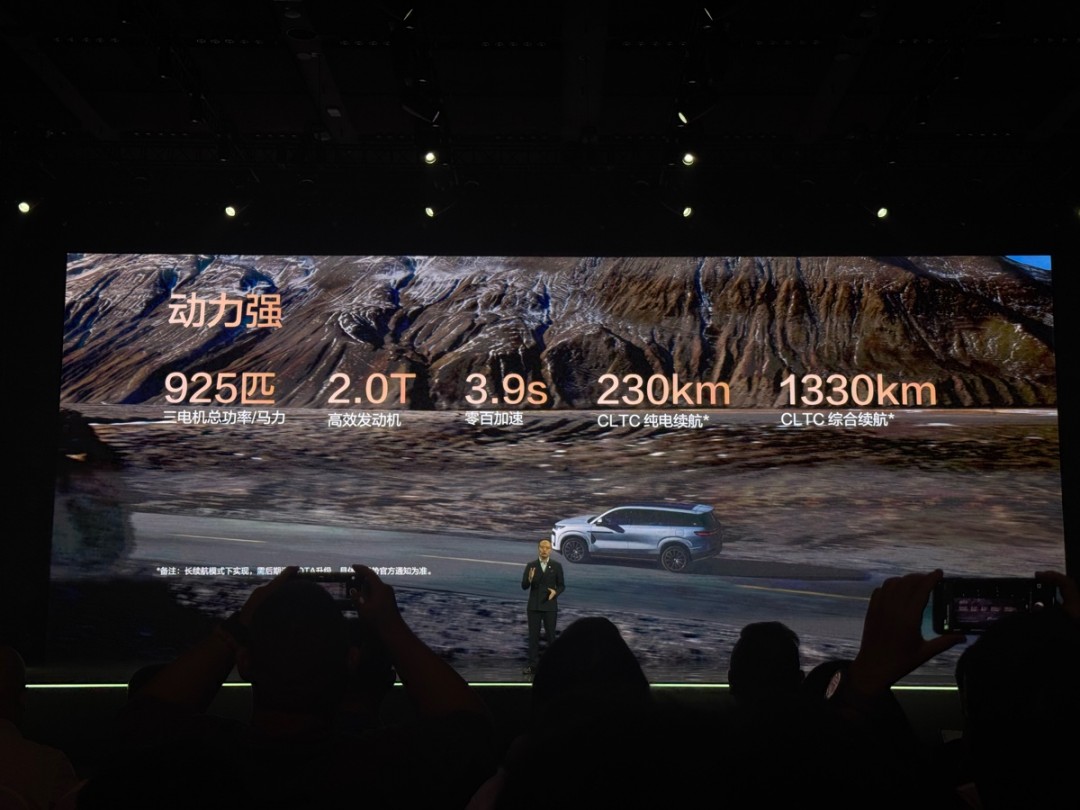 动力方面,新车采用了插混专用2.0T高效发动机,配合EHS电混系统,三电机的总功率925马力,实测百公里加速仅需3.9s,CLTC纯电续航230km,综合续航1330km。