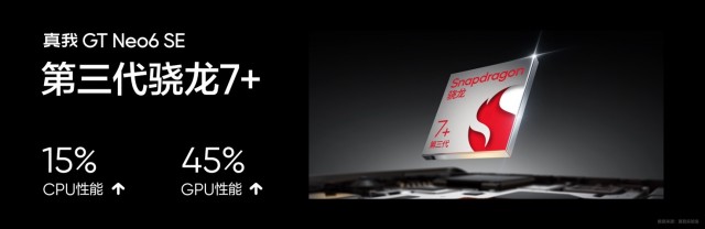 配置方面,真我GT Neo6 SE搭载第三代骁龙7+处理器,相比于上一代,第三代骁龙7+的CPU性能提升15%,GPU性能提升45%。
