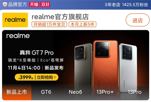 据真我手机官方此前宣布,全新的真我GT7 Pro将于11月4日14点正式发布,而抢在发布会之前,天猫realme官方旗舰店已经“泄露”了该机的售价,为3999元起。