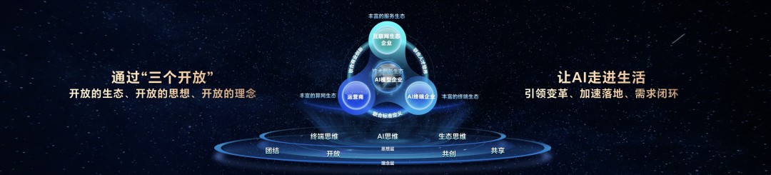 该生态联盟将以“团结、开放、共创、共享”为核心理念,围绕“终端思维、AI思维、生态思维”的三层思维架构,通过联合技术创新、标准定义、商业创新和人才培养等多方面的协同合作,解决AI落地的难题。