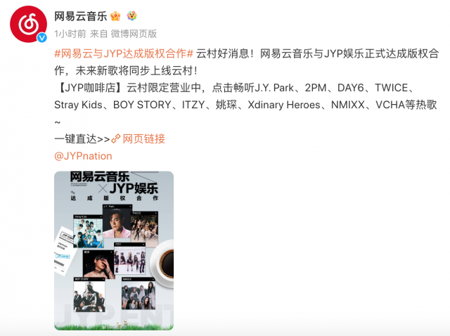 网易云音乐将为用户提供JYP娱乐众多音乐作品,JYP娱乐旗下艺人音乐版权回归,网易云音乐已与SM公司、YG娱乐、CUBE娱乐等韩国著名音乐公司达成版权合作。
