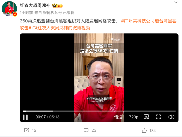 【TechWeb】5月27日消息,360集团创始人周鸿祎发布视频称,360再次追查到台湾黑客组织对大陆发起网络攻击。
