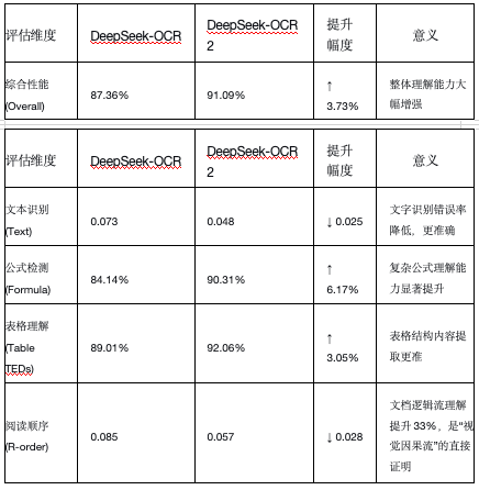 3个月时间,从DeepSeek-OCR到DeepSeek-OCR 2,论文提到在权威的综合性文档理解基准OmniDocBench v1.5上,DeepSeek-OCR 2取得了91.09% 的分数,较其前代大幅提升3.73%。