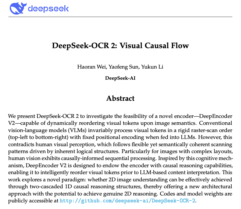 【TechWeb】1月27日消息,深度求索(DeepSeek)团队发布了论文《DeepSeek-OCR 2: Visual Causal Flow》并开源了同名模型DeepSeek-OCR 2。这一模型是对去年10月20日发布的DeepSeek-OCR模型的升级。