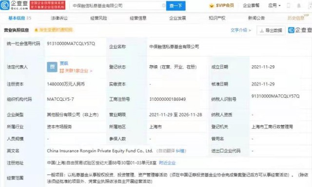 【TechWeb】企查查APP显示,11月29日,中保融信私募基金有限公司成立,法定代表人为贾飙,注册资本148亿元人民币,经营范围包含:以私募基金从事股权投资、投资管理、资产管理等活动。