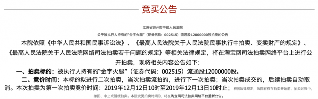 此次拍卖起始日为2019年12月12日10时,截止日期为2019年12月13日10时,拍卖理由为司法拍卖。淘宝拍卖网页显示,本次被拍卖股份起拍价合计近3.34亿元。法院表示,第一次拍卖起拍价不低于评估价或者市价的70%。如果出现流拍,再行拍卖时,人民法院可以酌情降低起拍价,但降低的数额不会超过前次起拍价的20%。