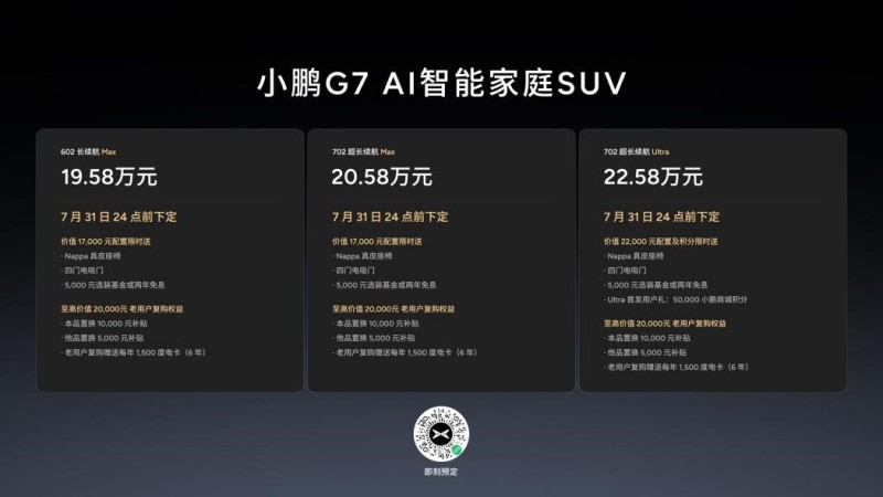 【TechWeb】7月3日消息,今日,小鹏汽车正式发布小鹏G7。新车共推出602长续航Max、702超长续航Max、702超长续航Ultra三个版本,官方指导售价分别为19.58万元、20.58万元和22.58万元,上市即刻可以交付。