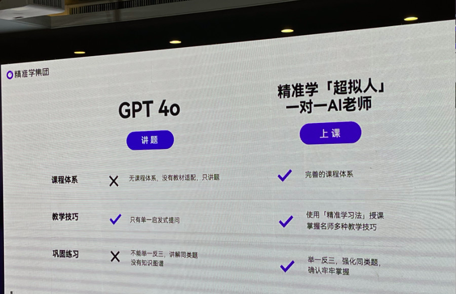 杨仁斌称:“GPT-4o只能讲题,并不能体系化地教学,依旧没有达到一个“一对一AI老师”的标准。精准学发布的“超拟人一对一AI老师”通晓国内超95%地区、100+中考考区的个性化教研数据;精通3-9年级的各层级教学内容、擅长构建各学科知识体系,并能够带领孩子高效完成知识点预习、作业检查、考前复习及备考冲刺等各个重要学习环节。是真正在中文语境下为中国孩子学习量身定制的一位全能老师。”