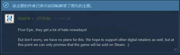 表示游戏将在Steam平台发售,没有Epic平台独占的计划,但是目前我们可以承诺游戏将在Steam平台售卖。