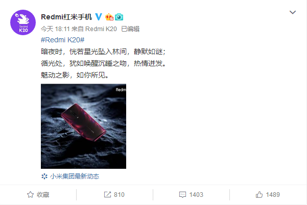 Redmi官方晒红米K20旗舰背部照:魅动之影 如你所见快报