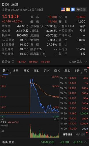 不过,滴滴上市首日的股价却是高开低走。开盘后不久一度涨超20%,随后大幅回落,一度险些跌破发行价。截至收盘,滴滴报收14.14美元,微涨1%,总市值678亿美元。