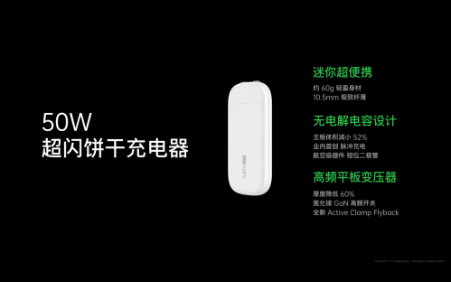 50W 超闪饼干充电器采用全新充电技术——脉冲充电,从超高功率的有线、无线充电到更加便携兼容的充电器,65W AirVOOC 通过超高功率让无线闪充也开始成为主流的充电方式。