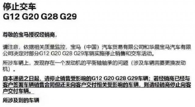 【TechWeb】近日,网络流传的一封宝马致授权经销商内部通知显示,依据相关质量监控,宝马(中国)汽车贸易有限公司(以下简称宝马中国)和华晨宝马汽车有限公司决定对部分G12、G20、G28、G29车辆实施停止销售和交车活动。在上述所涉车辆上,发现存在一个发动机的平衡轴轴承的问题,涉及车辆需要更换发动机。