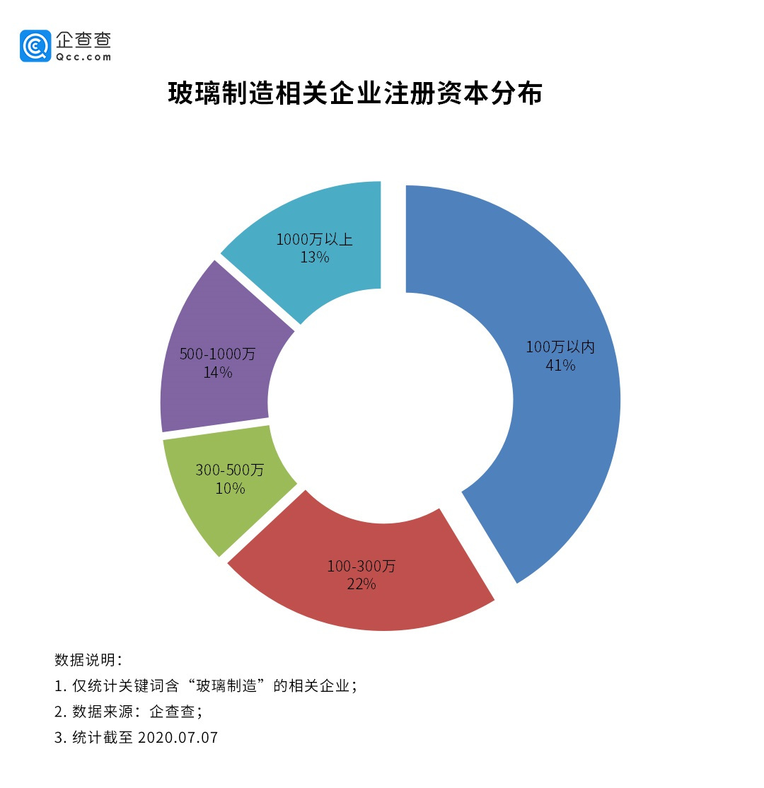 从企业注册资本分布来看,我国玻璃制造相关的企业注册资本在100万之内的企业最多,占比达到41%。500万之内的企业最多共计10.7万家,占比73%。注册资本在1000万以上的企业数量占比最少,共1.9万家,占比13%。