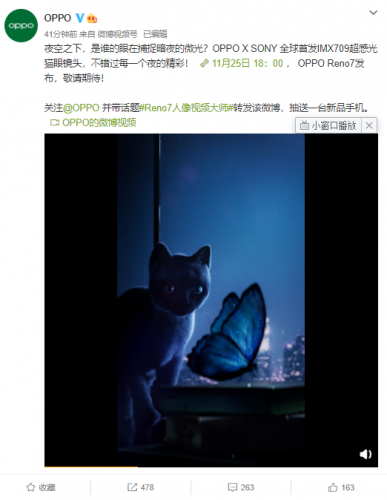 【TechWeb】随着2021年年底的日益临近,手机圈也进入了一年里最后的高潮,不少厂商都将在仅剩的一个多月时间中推出自家的代表性旗舰新品。据官方日前发布的信息,OPPO将于11月25日晚18:00正式推出全新的Reno7系列机型,包含Reno 7SE、Reno 7和Reno 7 Pro三个版本。现在有最新消息,近日OPPO官方再度带来最新预告,该机将首发与索尼合作的IMX709超感光猫眼镜头。