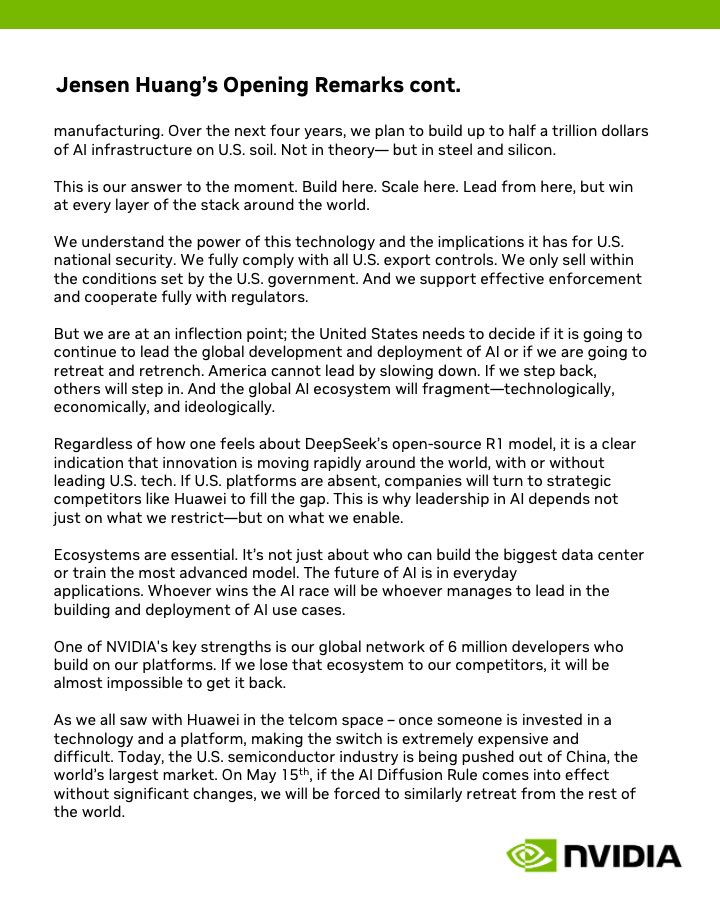 黄仁勋还特别提到:“正如在电信领域看到的华为一样,一旦有人投资了一项技术和平台,转换就会极其昂贵且困难。如今,美国半导体行业正被挤出中国这个全球最大的市场。5月15日,如果《AI扩散规则》在没有重大变化的情况下生效,我们将被迫从世界其他地区进行类似的撤退。”