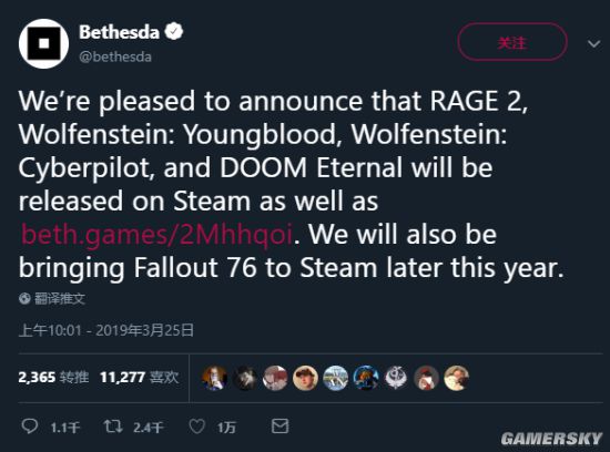 永恒》均将登陆Steam平台和B社自家平台Bethesda.net,《辐射76》也将登陆Steam平台,表示旗下四款游戏新作《狂怒2》、《德军总部。