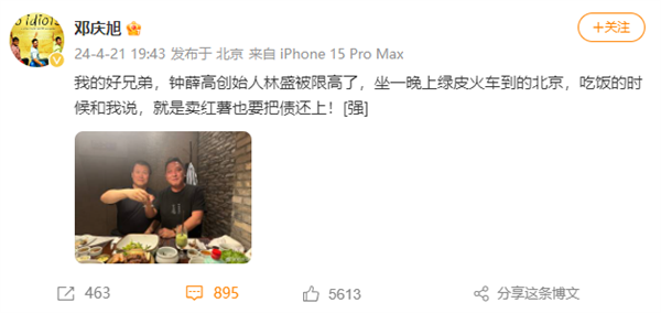 今年4月,新浪财经CEO邓庆旭发微博称,林盛被“限高”后,坐了一晚上绿皮火车到北京,林盛对他说,“就是卖红薯也要把债还上”。