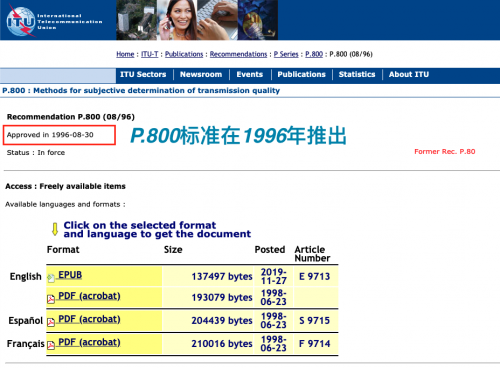 MOS最早源于电话的语音质量评价。这项评价标准由ITU(InternationalTelecommunicationUnion,国际电信联盟简称国际电联)在1996年,作为囊括在《P.800: Methods for determination of transmission quality 》中的一个「子标准」沿用至今,字面意思不难看出,这是个围绕「主观」(subjective)——也就是人工听觉、人工打分的一项判定方法。