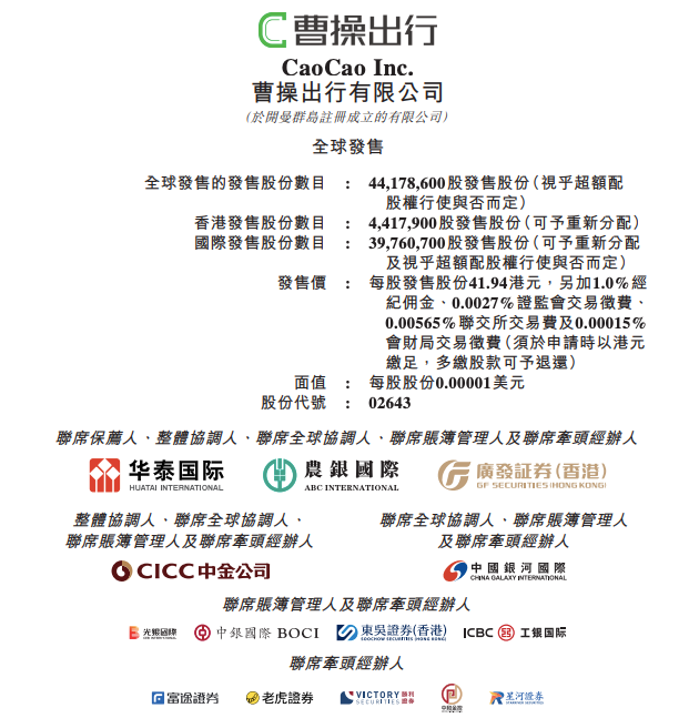 公告显示,曹操出行计划全球发售4417.86万股股份,其中香港发售股份为441.79万股,国际发售股份为3976.07万股,每股发售价为41.94港元。预计募资18.53亿港元。