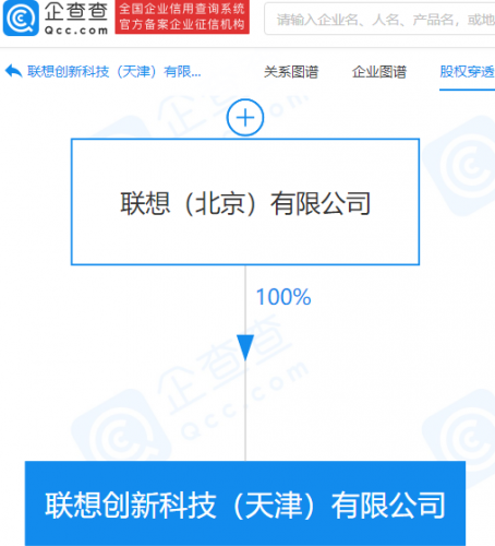 企查查股权穿透显示,该公司由联想(北京)有限公司100%控股。