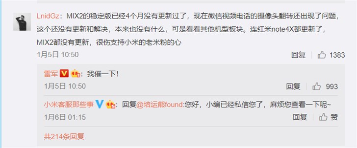 有网友在雷军的微博下询问称“MIX2的稳定版已经4个月没有更新过了,现在微信视频电话的摄像头翻转还出现了问题,这个还没有更新和解决,本来也没有什么,可是看看其他机型板块。连红米note4X都更新了,MIX2都没有更新,很伤支持小米的老米粉的心。”