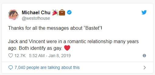 随后小说作者Michael Chu在推特上也证实了士兵76是一位同性恋:“感谢所有关于《猫神》的留言,杰克和文森特多年前就恋爱了,他们俩都是同性恋。”