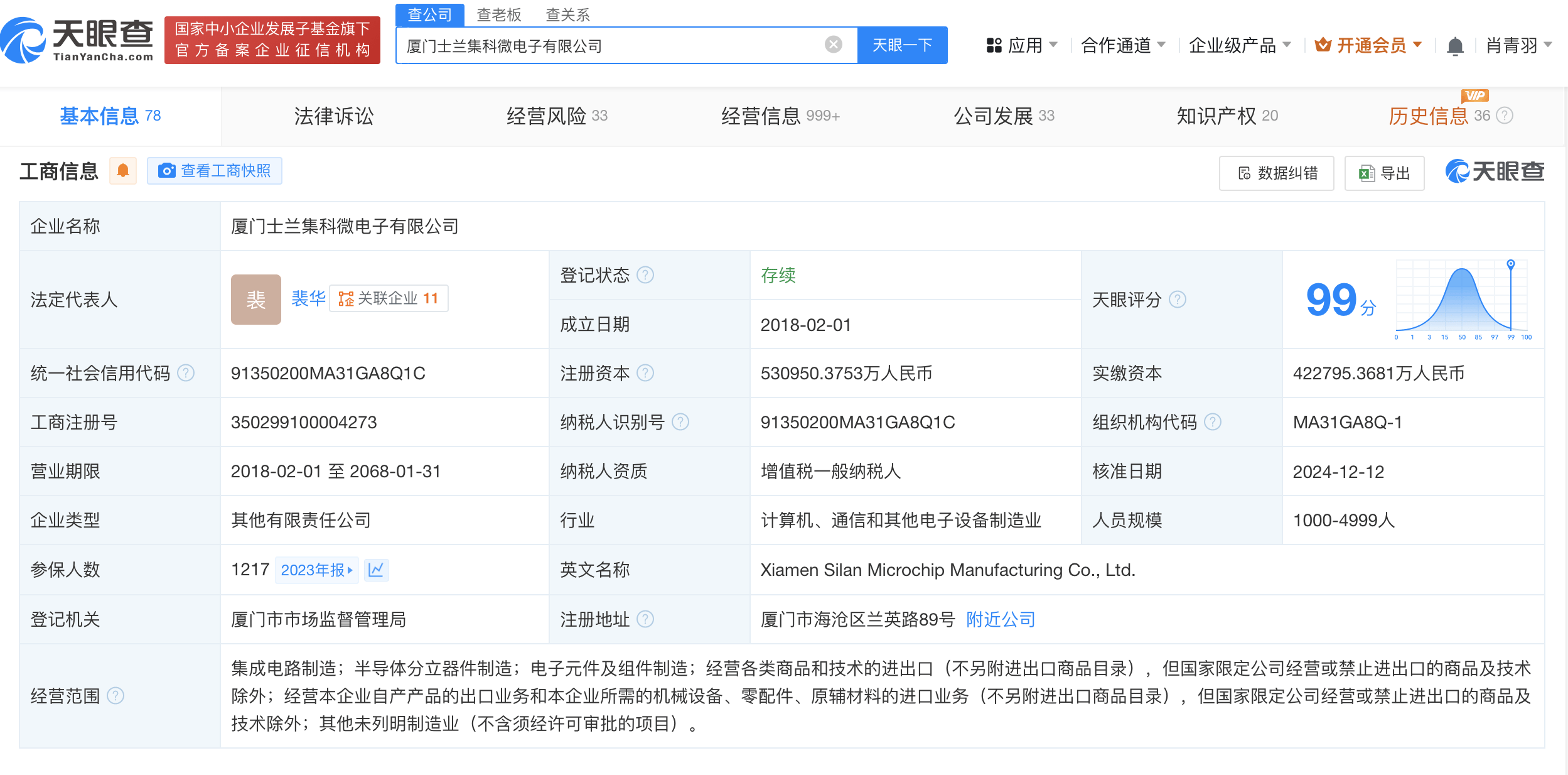天眼查App显示,近日,厦门士兰集科微电子有限公司发生工商变更,注册资本由约38.3亿人民币增至约53.1亿人民币,增幅约39%。