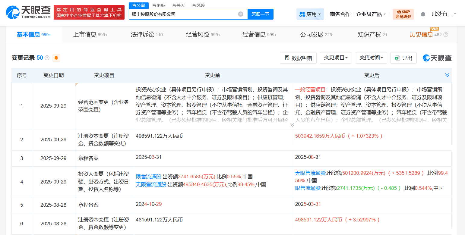 天眼查App显示,近日,顺丰控股(002352)发生工商变更,注册资本由约49.9亿人民币增至约50.4亿人民币。值得一提的是,今年8月,该公司注册资本由约48.2亿人民币增至约49.9亿人民币。