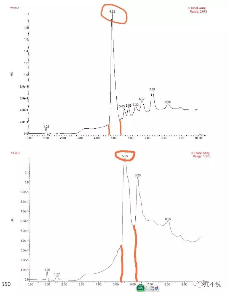 两瓶样本的图谱形状大不相同,两者主要成分(峰值)流出时间点前后相差0.6分钟即36秒,远大于0.1分钟的误差范围。可以明确无误地判定:两瓶同款洁颜油的主要成分完全不一致。(“液质联用”的原理还算有趣,好奇的朋友可以去知乎)