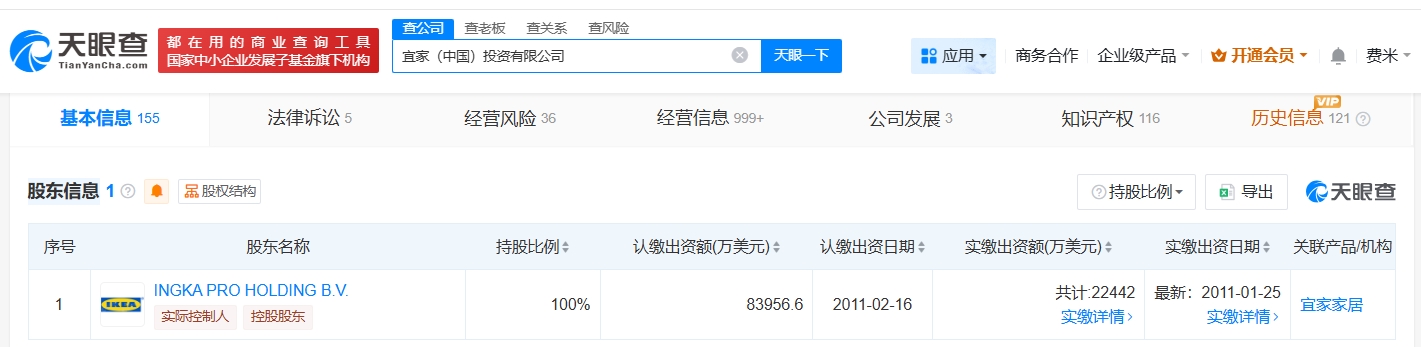 天眼查工商信息显示,宜家(中国)投资有限公司成立于2007年7月,法定代表人为PER PONTUS HAAKAN ERNTELL,注册资本约8.4亿美元,经营范围包括在包括零售业在内的国家法律鼓励和允许外商投资的范围内进行投资等。股东信息显示,该公司由INGKA PRO HOLDING B.V.全资持股。对外投资信息显示,该公司对外投资42家企业,其中39家处于存续状态,长春宜家家居有限公司、宜家家具配件(深圳)有限公司、北京宜家咨询有限公司已注销。