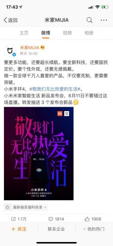 米家表示,小米手环4将有超长待机、全新科技和国民定价,目标做一款全球千万人喜爱的产品,并将于6月11日直播发布。