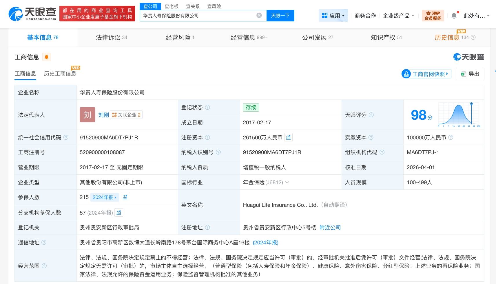该公司成立于2017年2月,法定代表人为刘刚,经营范围含普通型保险、健康保险、意外伤害保险、分红型保险,上述业务的再保险业务等。股东信息显示,该公司由中国贵州茅台酒厂(集团)有限责任公司、华康保险代理有限公司、贵州贵安资本运营有限公司等共同持股。