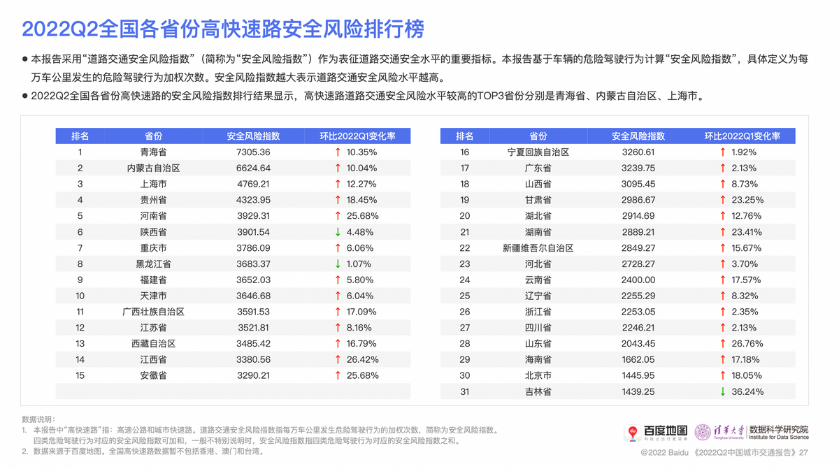 近日,百度地图联合清华大学数据科学研究院交通大数据研究中心,发布了《2022年第2季度中国城市交通报告》(以下简称《报告》)。该报告从交通强国建设的“安全、便捷、高效、绿色、经济”五大基本特征出发,基于对交通大数据的分析,反映第二季度我国主要城市的交通运行及发展情况。《报告》首次发布了道路交通安全风险指数,进一步为智能交通建设和管理提供有价值的参考。