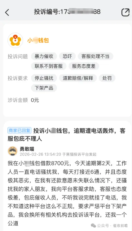 2月26日当天,投诉平台接连收到两笔针对小花钱包的投诉,时间相近、情节相似,直指平台催收机制存在严重合规漏洞。