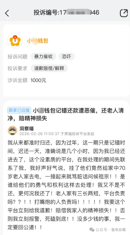 无独有偶,用户“洞察喵”的遭遇更令人愤慨。该用户常年准时还款,仅因过年期间记错时间,逾期不到一天便被催收。用户已完成还款操作后,平台仍继续催收,甚至直接致电其家中70岁老人,接通后公然辱骂、问候亲属,言语低俗、态度嚣张。老人年事已高,突如其来的恶意骚扰极易引发健康风险,用户表示将报警维权,要求平台公开道歉并赔偿精神损失。