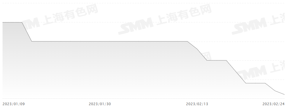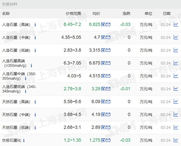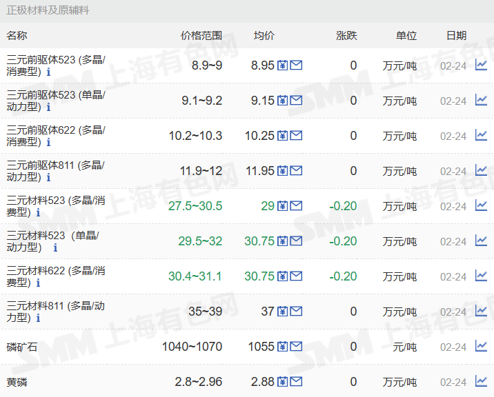 根据上海有色网数据,截至2月24日,电池级碳酸锂均价39.975万元/吨,工业零级碳酸锂均价36.8万元/吨;电池级氢氧化锂(56.5%国产粗颗粒)均价44万元/吨,工业级氢氧化锂均价41.2万元/吨。三元材料方面,523多晶、523单晶、622多晶、811多晶均价分别报每吨29,30.75,30.75,37万元。