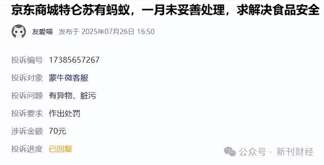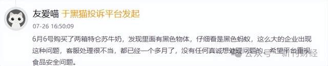 7月26日,黑猫投诉平台上一则消费者投诉显示,其在京东商城购买的特仑苏牛奶存在食品安全问题。据投诉者描述,其于6月6日购买了两箱特仑苏牛奶,饮用时发现牛奶中有黑色异物,经仔细辨认确认为黑色蚂蚁。消费者表示,问题发生后已向平台反映,但时隔一个月仍未得到妥善处理,故通过投诉平台寻求解决。