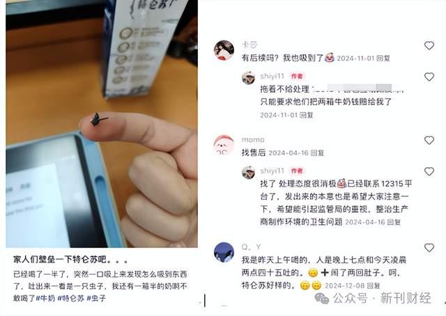 另有消费者在小红书平台反映特仑苏牛奶存在其他食品安全问题。2024年8月28日,一名消费者称,在饮用特仑苏牛奶时,吸入口中的异物吐出来后发现是一只虫子,剩余的一箱半牛奶因担忧质量问题不敢继续饮用。从其提供的照片来看,疑似为苍蝇状异物。此外,在其动态评论区,2024年11月1日及12月8日,另有消费者先后遭遇牛奶中出现异物的状况。