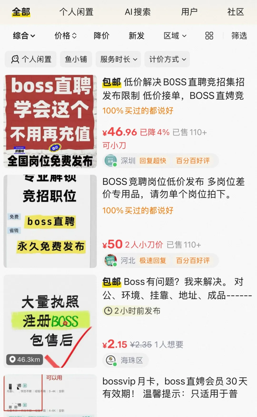 那有没有省钱的办法?你去看看闲鱼。BOSS直聘的VIP月卡,竞招改普招低价发布等等,省钱妙招多的是。