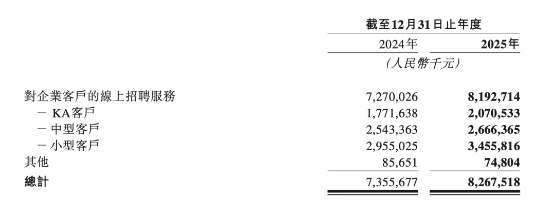 2025年全年,BOSS直聘KA、中型、小型三类客户贡献的收入全部实现增长。其中小型客户(年付费5000元及以下)收入占比从2024年的40.6%提升至了42.2%。很明显这批小型客户,就是刚入驻BOSS直聘的蓝领行业老板或县城小店主。