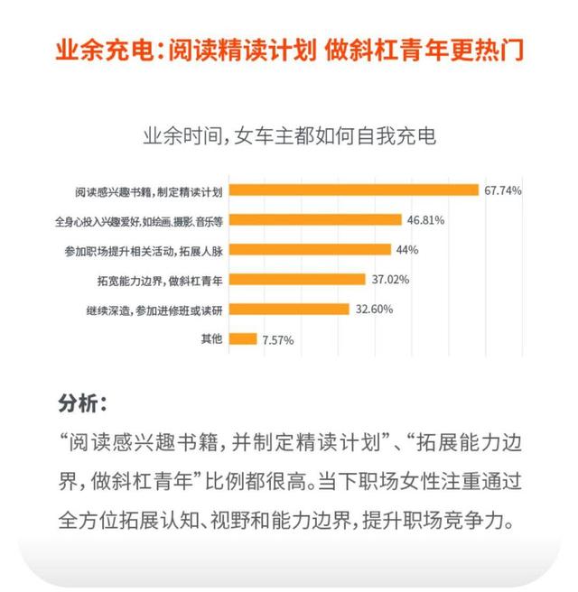 ——受访女性车主谈业余充电,有近7成会“阅读并制定精读计划”,近4成会“做斜杠青年”。