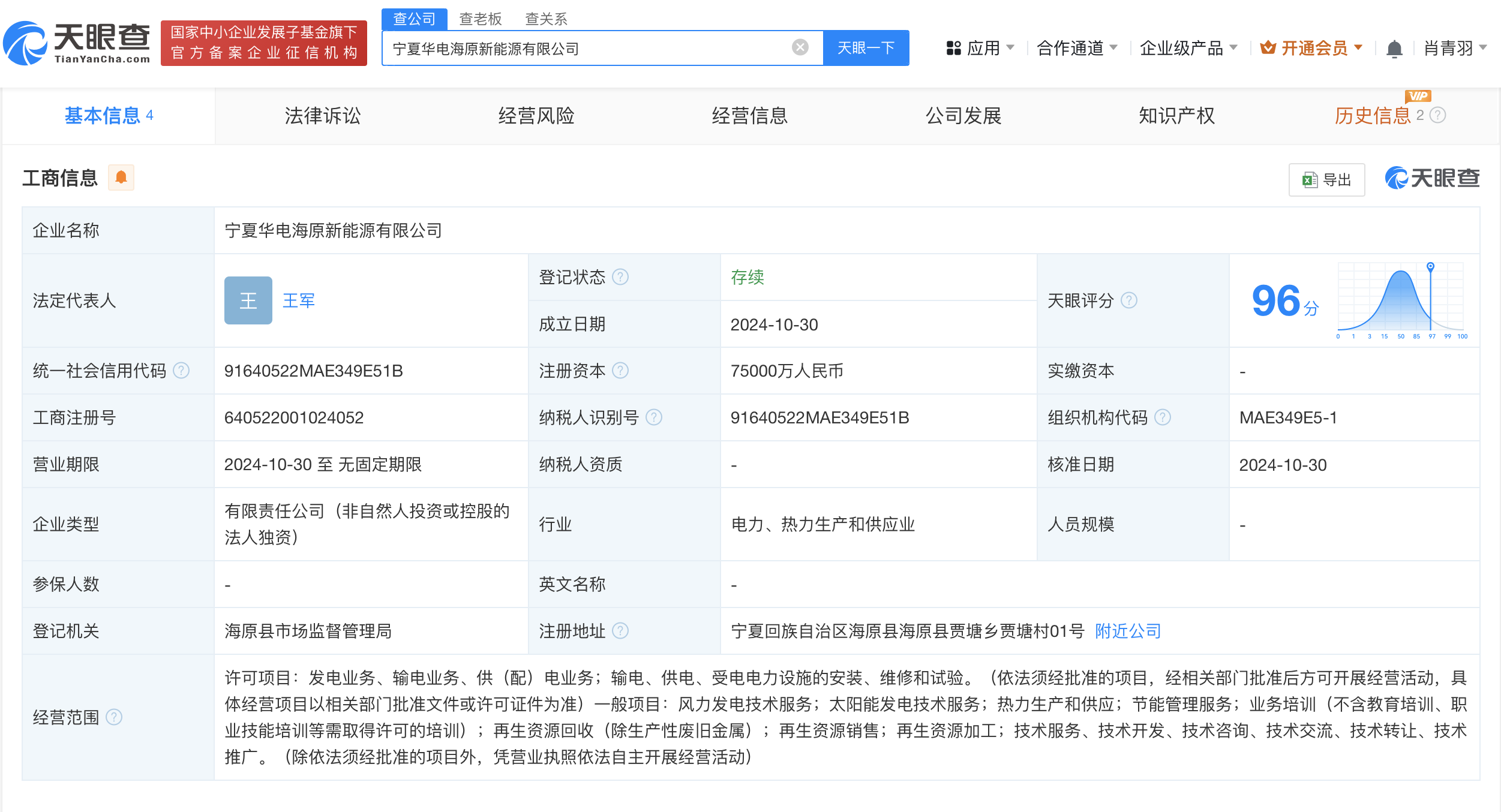 天眼查App显示,近日,宁夏华电海原新能源有限公司成立,法定代表人为王军,注册资本7.5亿人民币,经营范围含风力发电技术服务、太阳能发电技术服务、热力生产和供应、节能管理服务等。