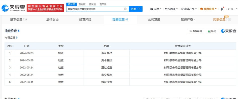 天眼查App显示,盐城市海创源食品有限公司成立于2020年3月,法定代表人为王丽莉,注册资本500万人民币,经营范围包括食品生产、食品经营、食品互联网销售等,由王丽莉、王兵共同持股。变更记录显示,2022年7月,该公司经营范围新增水产品冷冻加工。此外,值得注意的是,在2022年、2024年的三次抽查检查中,该公司被责令整改。