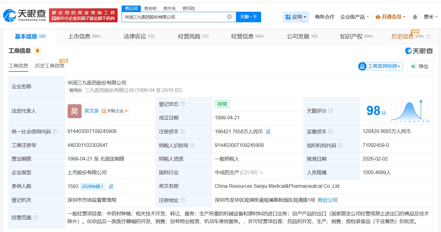 天眼查App显示,近日,华润三九(000999)发生工商变更,注册资本由约12.8亿人民币增至约16.6亿人民币,增幅约30%。