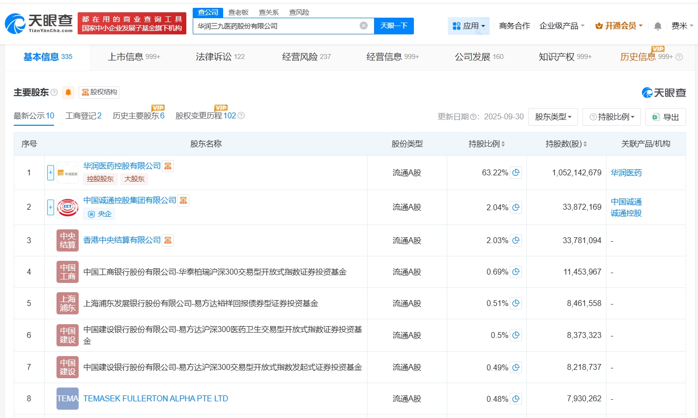 华润三九医药股份有限公司成立于1999年4月,法定代表人为吴文多,经营范围包括中药材种植、生产所需的机械设备和原材料的进口业务、自产产品的出口等,由华润医药控股有限公司、中国诚通控股集团有限公司、香港中央结算有限公司等共同持股。