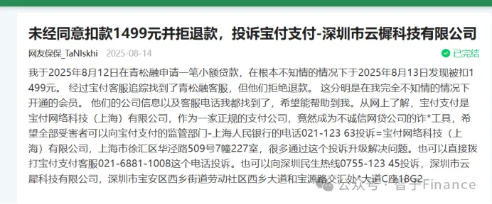 此外,还有用户被扣款899元、1240元,最高一笔扣款达1499元。2025年8月,有用户在消费保平台投诉,称其在不知情的情况下被扣款1499元,经支付渠道宝付客服追溯确认扣款方为青松融,但平台拒绝退款。
