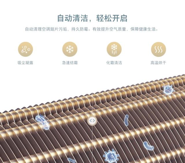 自清洁功能是C1的全新功能亮点,在该模式下,通过空调内机蒸发器急速结霜,冻结蒸发器翅片上的微尘,再启动化霜工作,将微尘从翅片剥离,再通过高温烘干除菌,从而自动清理空调内机翅片,起到抑制细菌滋生、持久防霉的效果,极大减少了人工清洁的繁琐工作。此外,再搭配高效抗菌过滤网,让空调出风更显健康、清新。