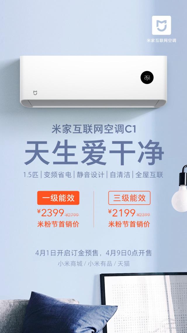 4月1日,米家互联网空调C1系列正式发布,作为小米全家桶新成员,支持米家app远程控制和小爱同学语音控制,并首次引入自清洁功能,结合全直流变频一级能效带来的静音节能高级体验,让用户使用更加安心、省心。4月1日,米家互联网空调C1将在小米商城、小米有品和天猫商城开启订金预售活动,4月9日全网开卖,米家互联网空调C1一级能效售价2799元,米粉节首销价2399元,米家互联网空调C1售价2399元,米粉节首销价2199元。